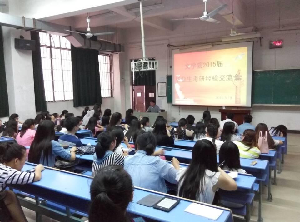 为进一步提高我院2012级学生的学习热情和考研激情,交流考研的学习方法和心得体会,分享已考取研究生同学的喜悦,5月19日下午,文学院2015届毕业生考研经验交流会在惟义楼7103室举行。学院对本次交流会高度重视,戴训超院长主持了交流会,副院长詹艾斌老师在听完大家发言后代表学院作了专题发言。学院研究生教学秘书朱倩老师以及有志于考研的2012、2013级本科学生100余人参加了交流会。