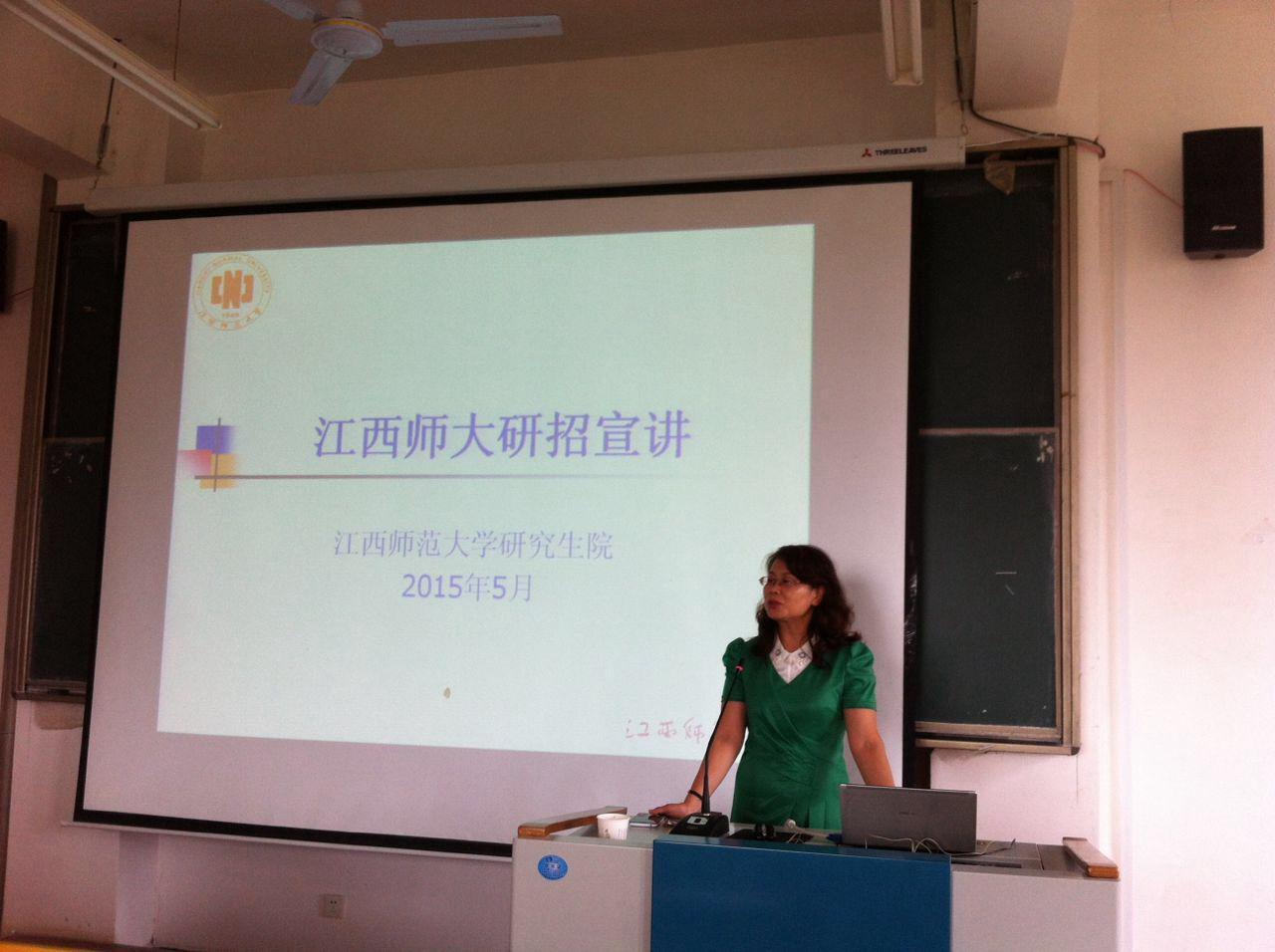 欧阳芬教授从学校、学院的学科建设、专业设置、师资力量、科研平台、培养特色、研究生招生与管理等几个方面对我校、我院的研究生工作向在座的师生进行了详细的介绍和说明。宣讲过程中,欧阳芬教授、邹花香副教授还给在座的学生分发了我院研究生招生宣传册,让他们对我院的研究生招生工作有进一步的了解。针对同学们踊跃提出的相关问题,欧阳芬教授和邹花香副教授都予以了积极解答,现场气氛非常热烈。