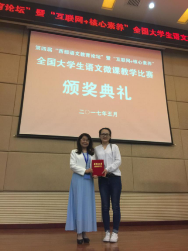 2017年5月6日至8日,由中国高等教育学会语文教育专业委员会主办的“第四届‘西部语文教育论坛’暨‘互联网+核心素养’全国大学生语文微课教学比赛”在西安陕西师范大学顺利举行。经过紧张比赛、激烈角逐,我院14级汉语言文学2班学生秦旭洁荣获此次全国大学生语文微课教学比赛一等奖。