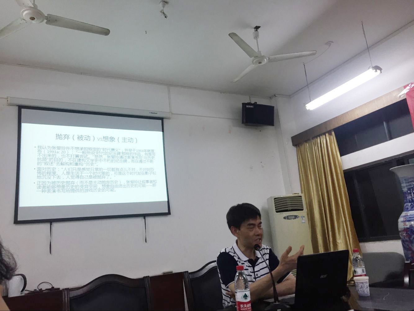 6月26日晚,美国加州大学圣地亚哥分校文学系主任、比较文学与中国研究特聘教授,上海交通大学人文学院访问讲席教授张英进先生莅临文学院,并于我院大会议室作了题为“张爱玲的超文典表演书写”的学术讲座。本次讲座由文学院院长詹艾斌教授主持。