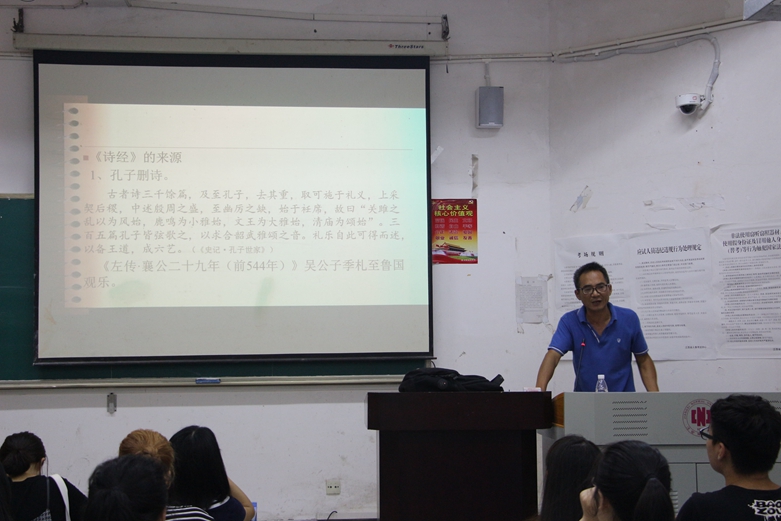 9月19日下午3时,文学院在惟义楼7205教室举办了系列讲座的第一场——“诗经与中国文化精神”,由文学院博士生导师李舜臣教授主讲,150余名师生参加。讲座上,李舜臣教授既详细地讲解了《诗经》的来源,又旁征博引地阐述了《诗经》与中国文化、礼乐文明、“和合文化”、讽谏精神的关系。他强调,“和合文化”实为“和文化”,即人与人、社会、天之间相互依存、和谐共处。