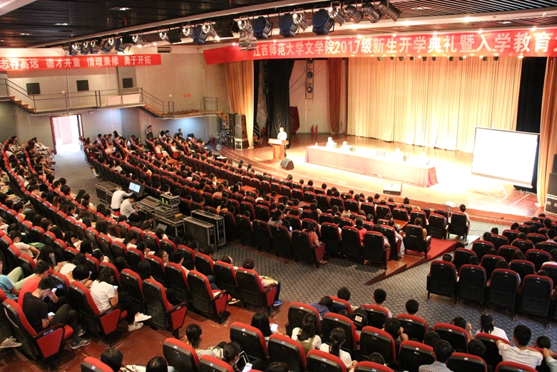 9月23日上午9时,文学院在先骕楼实验剧场隆重举行2017级新生开学典礼暨入学教育大会。文学院领导班子成员、教师代表及学院团委书记、新生辅导员、班主任、全体新生(本科生、硕士与博士研究生)、老生代表等600余人出席大会。大会由院党委副书记许靓静主持。