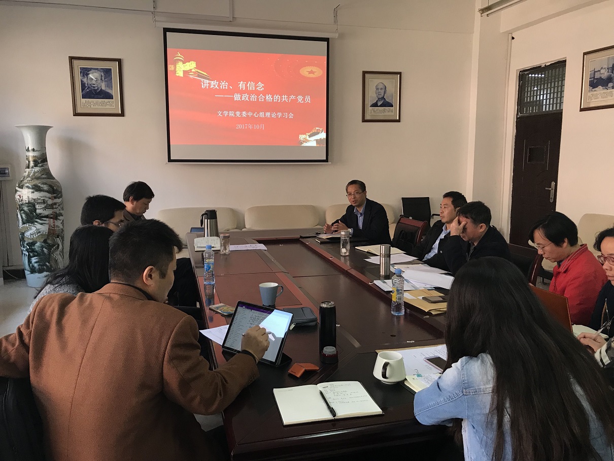 10月24日上午,文学院党委在名达楼小会议室3310召开理论学习中心组扩大学习会,就“讲政治、有信念,做政治合格的共产党员”进行专题学习。副院长詹艾斌主持并做主题发言,学院党委理论学习中心组成员、各支部书记参加了此次学习。