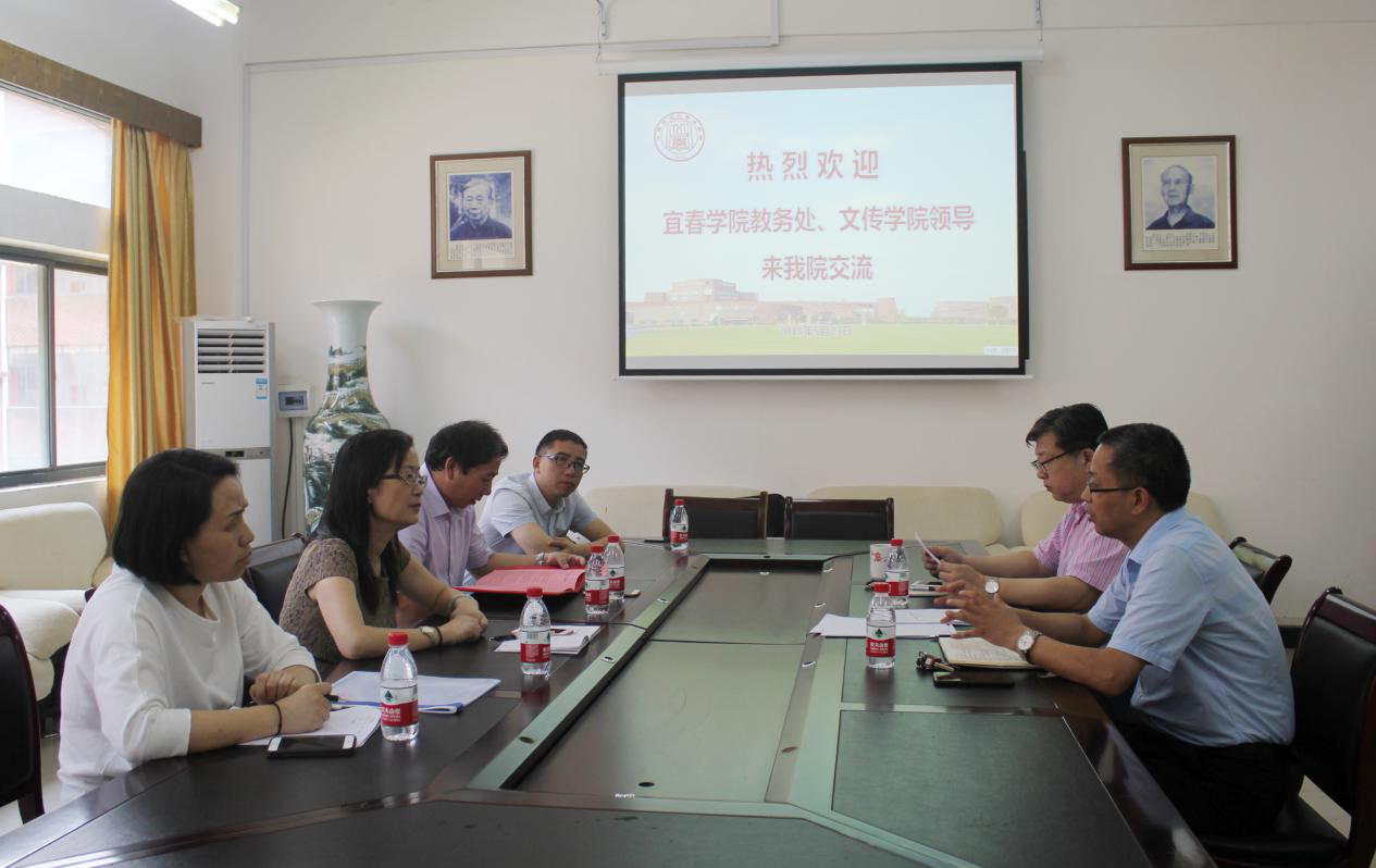 5月24日上午,宜春学院教务处处长李建军与文传学院主持工作副院长冷瑾一行4人来文学院考察交流,文学院院长詹艾斌、党委书记周宁参加了座谈。 宜春学院领导首先对其文传学院考入我院的硕士研究生情况作了说明,并感谢我院的积极支持。随后,双方就联合培养硕士研究生、硕士研究生指导教师遴选、中国语言文学学科建设、本科教学工作审核评估问题进行了充分的沟通与讨论。 最后,双方均表示,希望在江西省高校中国语言文学学科联盟的框架内,进一步深化两院合作,实现共同发展。
