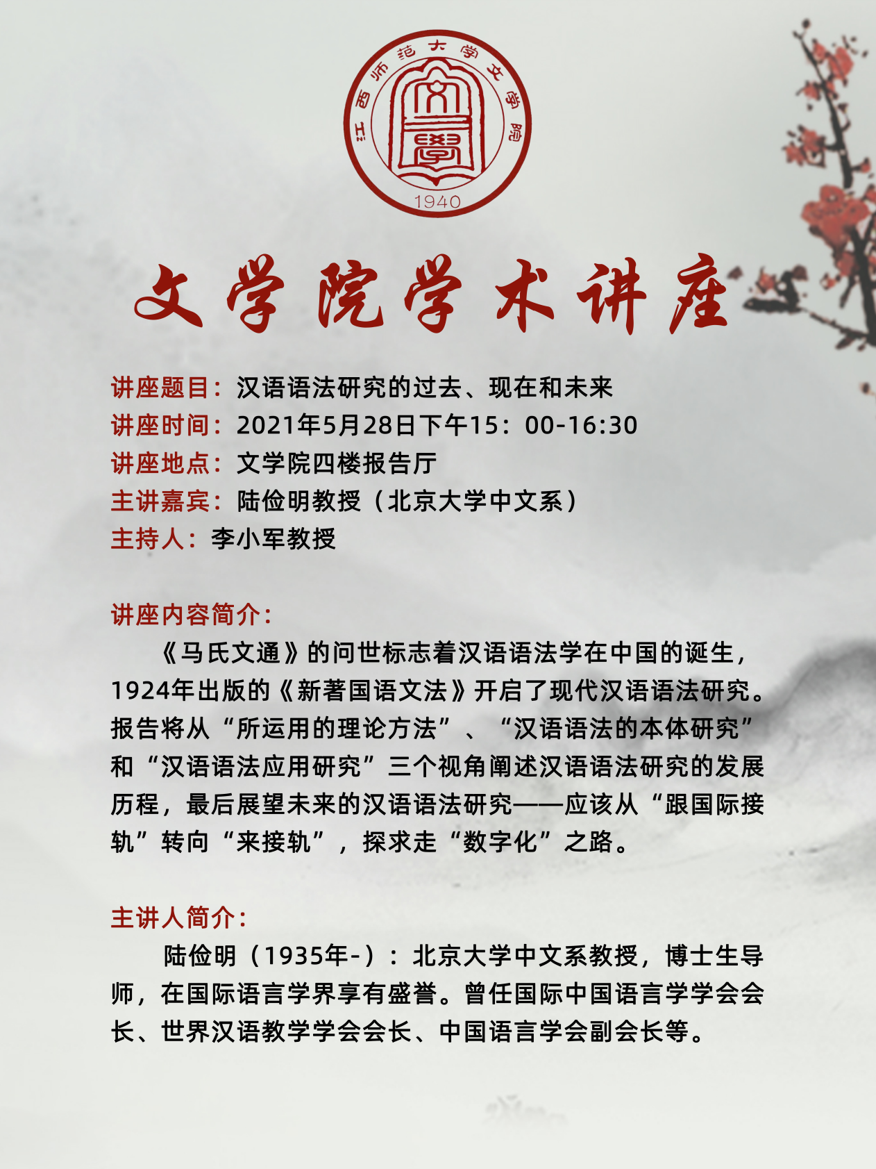 学术讲座:《汉语语法研究的过去、现在和未来》(主讲人:陆俭明)
