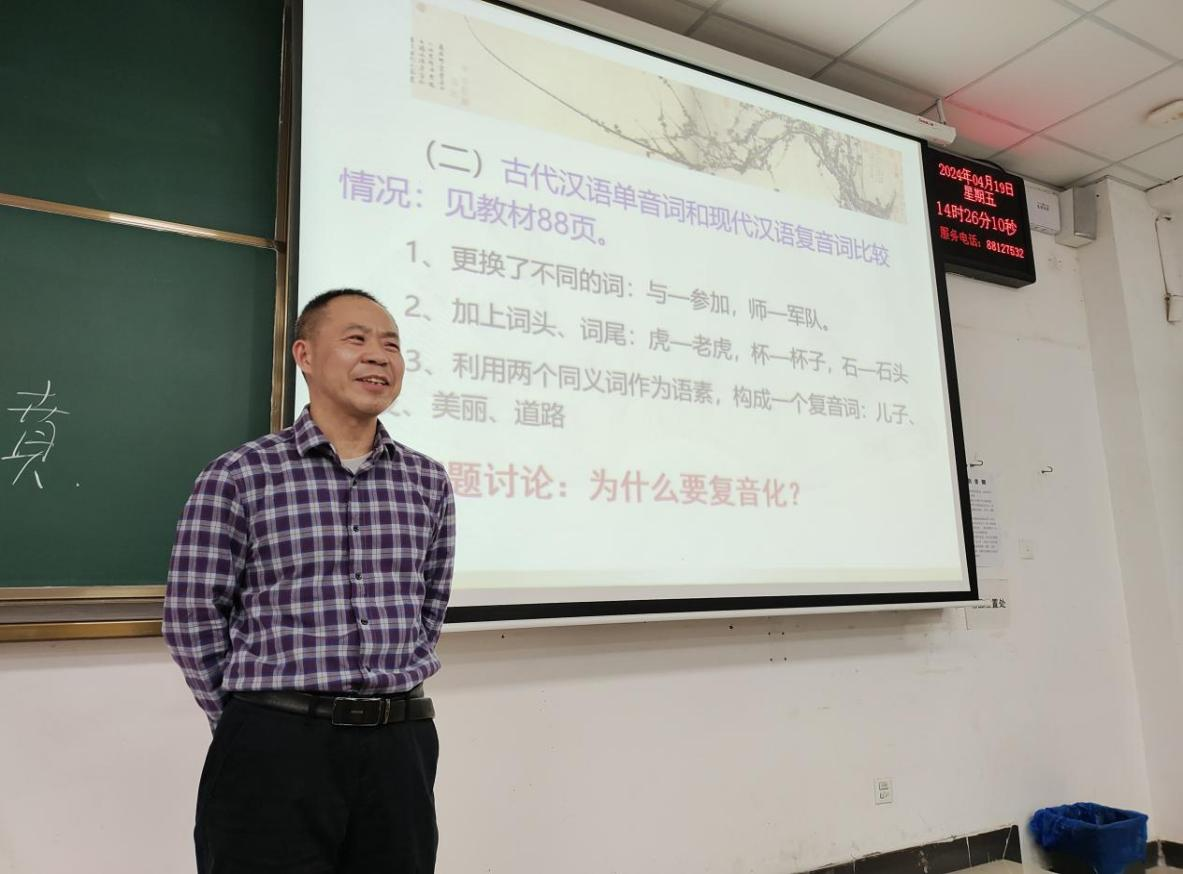 4月19号下午,《古代汉语》课程负责人李小军老师于惟义楼3307教室开展示范教学。李老师结合文本实例,讲授了单音词演变为复音词的三种途径,并针对复音化的原因进行了拓展,引领学生积极思考复音化的同时单音词的系列变化。