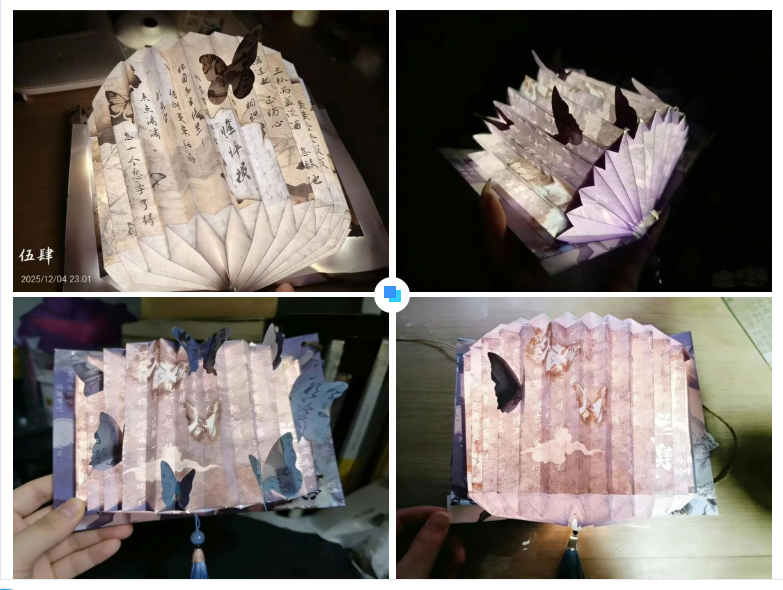 活动中,工作室提前准备了完整的书灯制作教学视频,清晰展示了书灯从基础折叠到复杂三角组合的全过程。教学视频在活动现场循环播放,方便参与者随时对照参考。随着制作的推进,纸张在同学们手中经过一次次精准对折与翻压,逐渐显现出立体灯罩的雏形。活动现场气氛专注而轻松,当遇到关键的“三角折叠”等难点步骤时,同学们或放缓动作反复观看视频细节,或与身旁同伴低声交流、互相观察做法。这种自主探索与邻座互学的模式,让制作过程更添一份沉浸与互动乐趣。随着时间推移,一盏盏造型典雅的古风书灯在桌面上陆续成型——纸质灯罩本身已展现出独特的光影层次与结构之美。