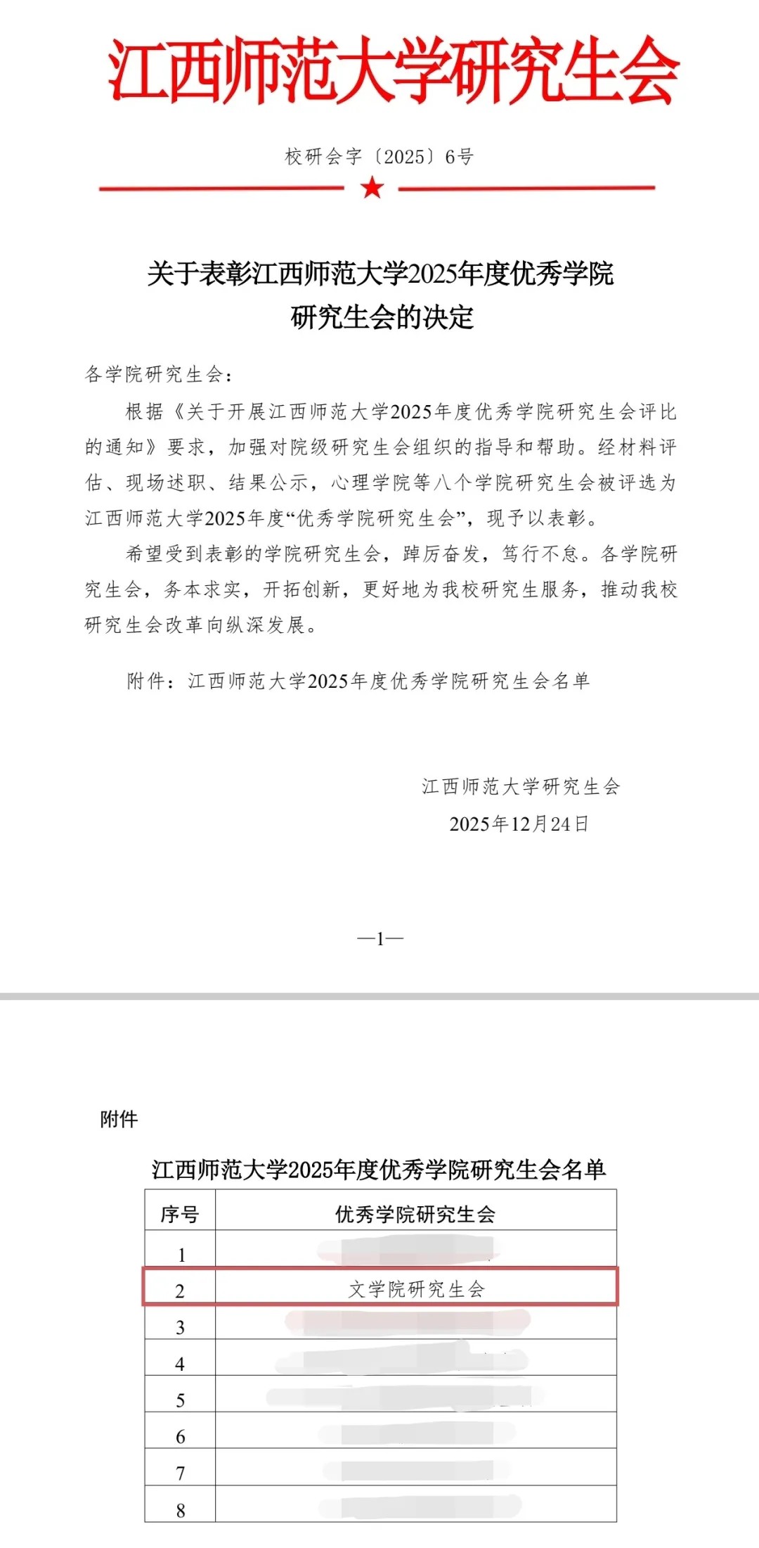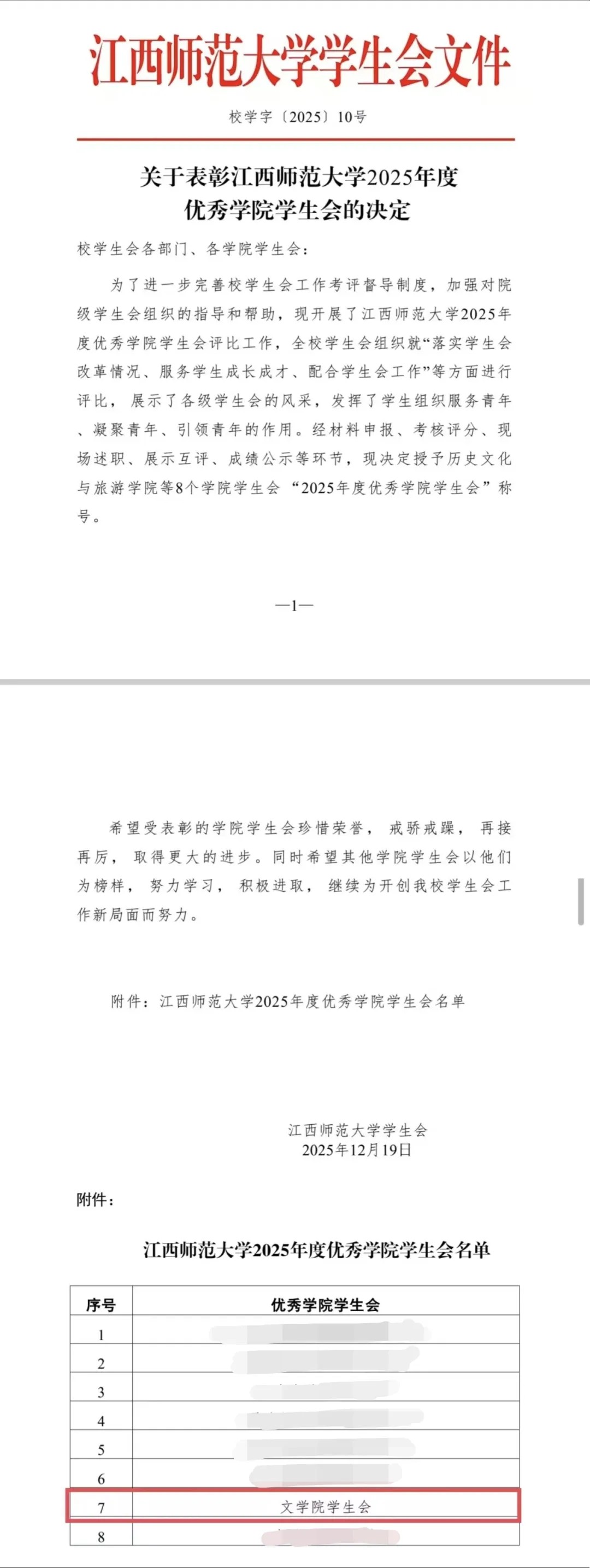 笔墨耕耘结硕果,青春聚力谱新篇。近日,文学院学生会、研究生会凭借亮眼的活动实绩、贴心的服务态度与严谨的组织管理,分别获得江西师范大学2025年度“优秀学院学生会”“优秀学院研究生会”称号。