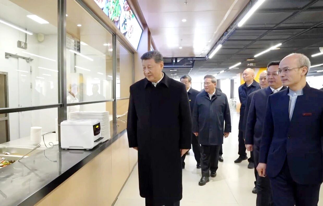 在学校食堂,习近平察看就餐环境、菜品种类等,叮嘱一定要确保学生饮食的安全和营养。离开学校时,师生们一齐向总书记问好,习近平勉励孩子们惜福奋进、积极向上,与雄安新区一起成长,与中国式现代化同步发展。