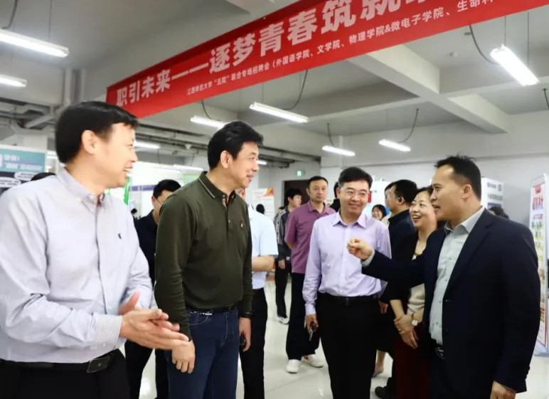 春风送暖,逐梦前行。4月10日,由文学院联合外国语学院、物理学院、微电子学院(原物理与通信电子学院)、生命科学学院、马克思主义学院联合举办的专场招聘会,在实验大楼一楼就业之家举办。校党委常委、副校长董圣鸿到场指导,学院党委书记徐强、党委副书记付婧及相关学院负责人参加。