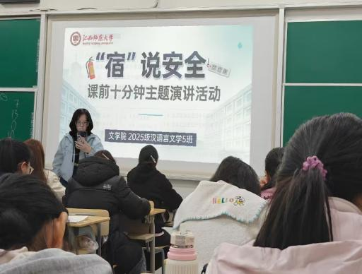为切实加强校园宿舍安全管理,全面提升2025级学生的宿舍安全防范意识,筑牢安全住宿防线,同时将安全教育与师范生职业能力培养相融合,文学院各班级利用晚自习时间,陆续开展“‘宿’说安全”主题演讲活动。活动以简短精炼的演讲为载体,既把安全知识传递至每一位同学心中,也为学生搭建了表达、实践的锻炼平台,助力师范生综合素养提升。